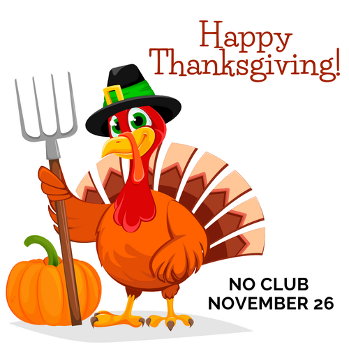 We won't have club on Wednesday November 26 due to the Thanksgiving holiday. We hope you enjoy special time with friends and family and look for ways to bless someone.