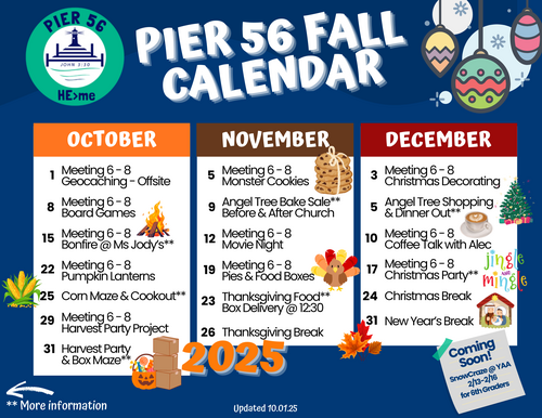 Signup for Pier 56 today! Each student attending Pier 56 needs to have a current 25/26 registration form on file so that we can love you well! Pier 56 students are age 10+ 9/10/25 and are in 5th grade. Register Online Here
